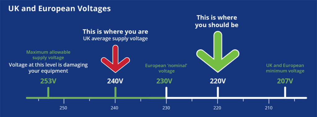 Electrical equipment (such as motors, HVAC and LED lighting) performs less efficiently when exposed to excessive voltage and poor power quality. For example, take a normal 230V rated lamp – when run at 240V, it will fail after 550 hours instead of 1000, drawing nine per cent more energy. Now imagine that problem spread across an entire site, with every single component failing faster and wasting energy. That’s expensive and will be corrected with our technology.